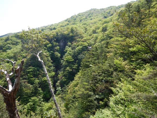 | 下山途中の尾根から見る市房山、右の山頂部も綺麗に見える