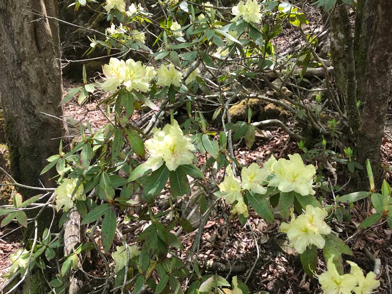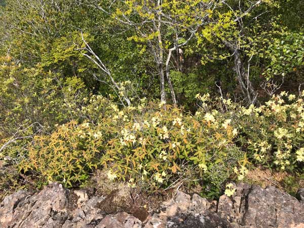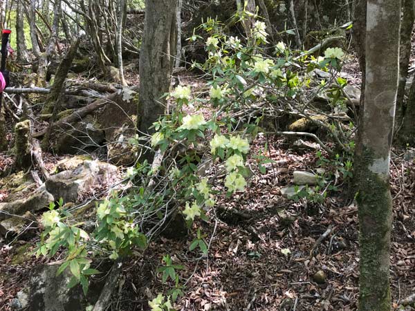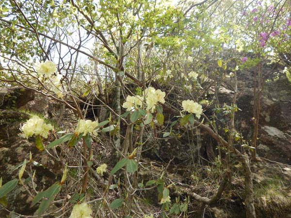 ところに日陰ツツジの淡い黄色が現れた。上に行くに従って多くなり、間近に
