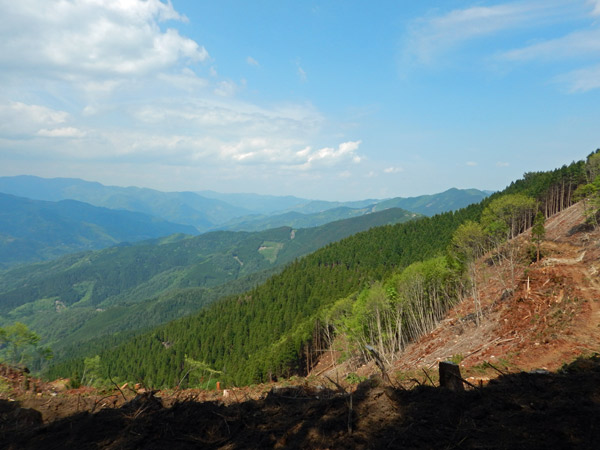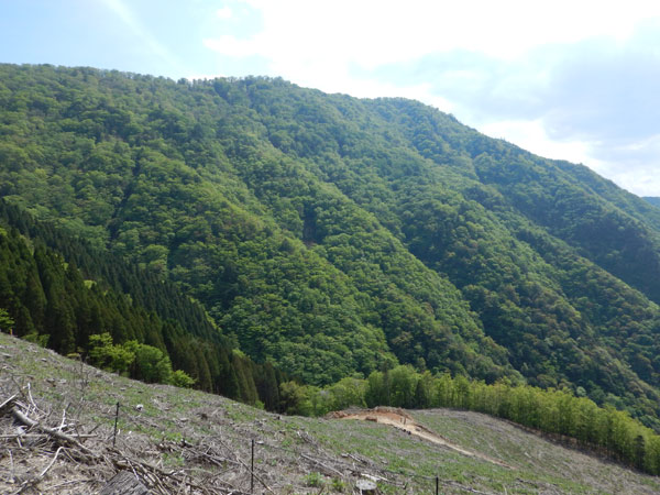 林道から馬口岳を振り返って見る 左が山頂部、右の沢を渡って植林の手前の尾根を登って行った