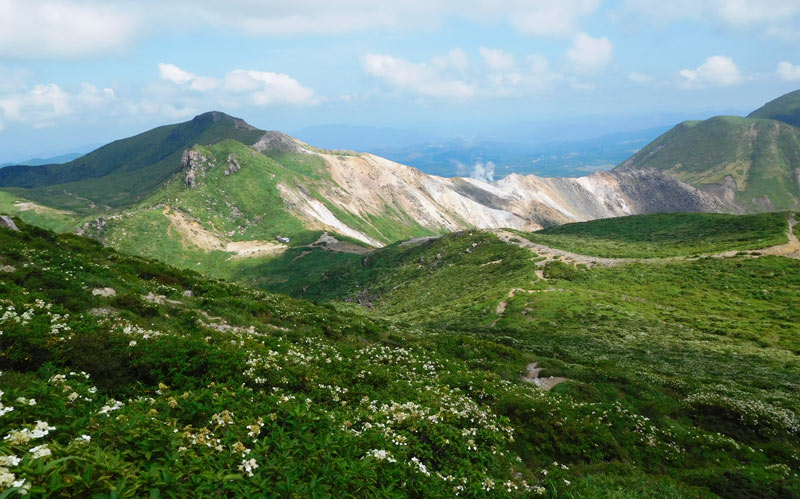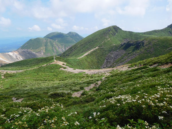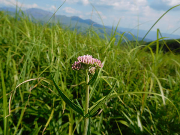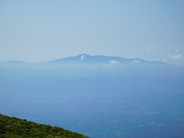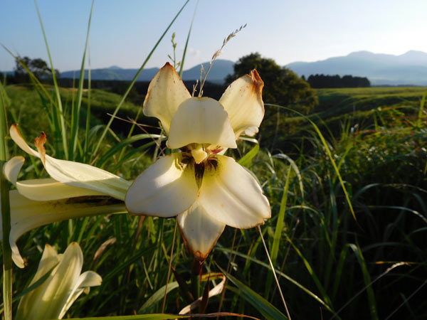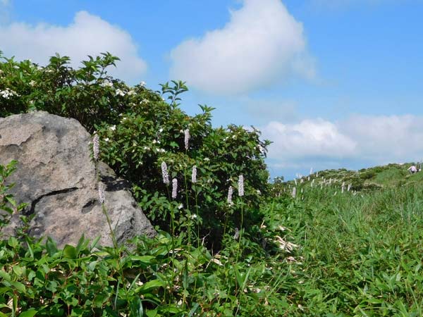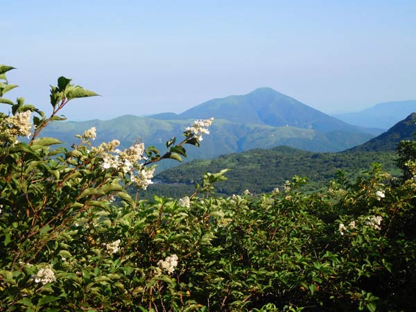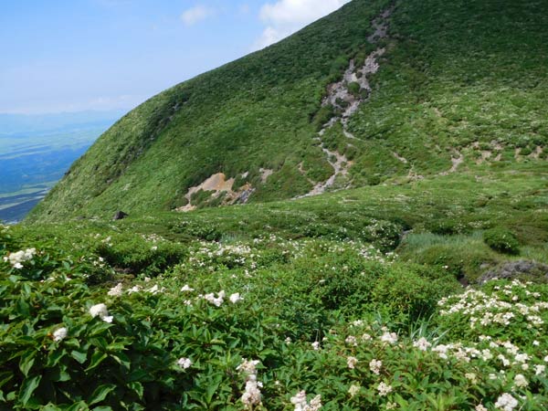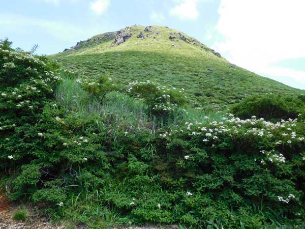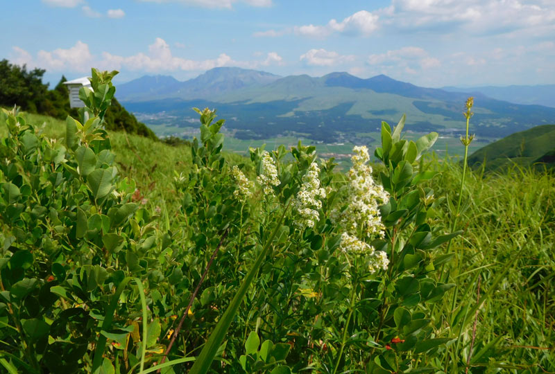 その先の丘の上から阿蘇を展望する 手前の白い花はカワラマツバ。 熊本地震の爪痕があらゆる所に残っていて心が痛む、阿蘇の根子岳の岩峰も崩れて ギザギザが丸くなっている。往生岳の山肌も幾筋もの崩れた跡が白く見える