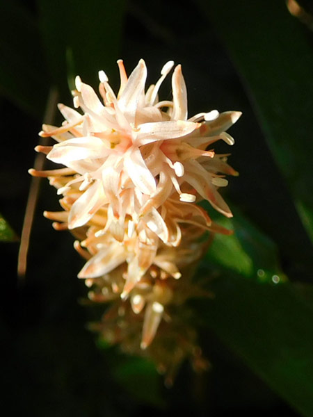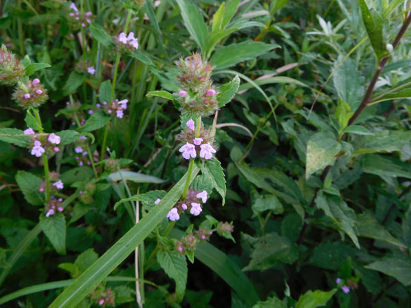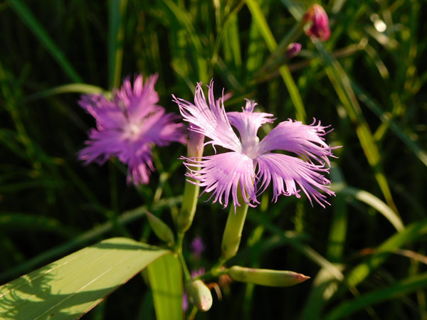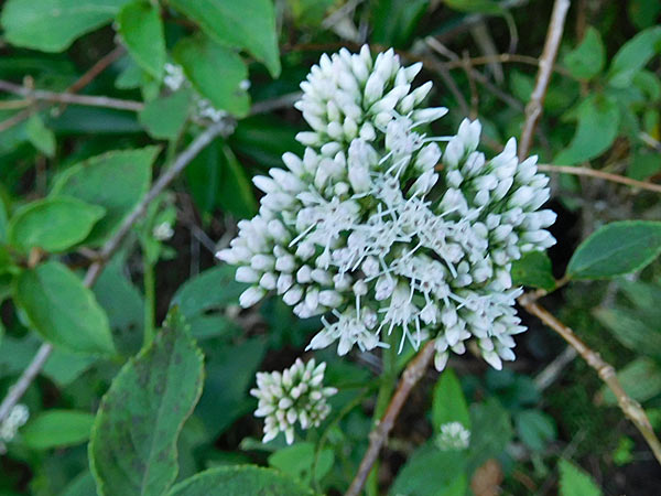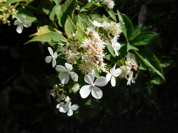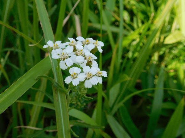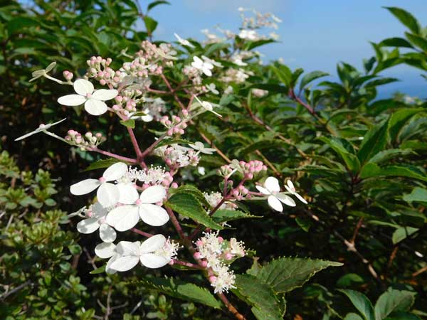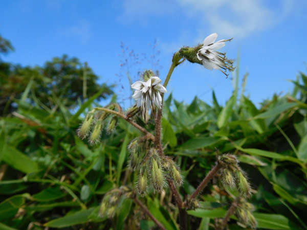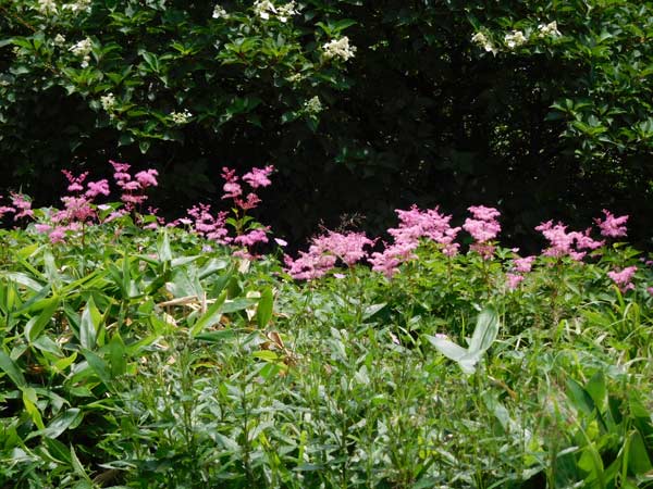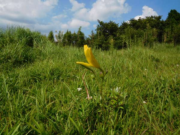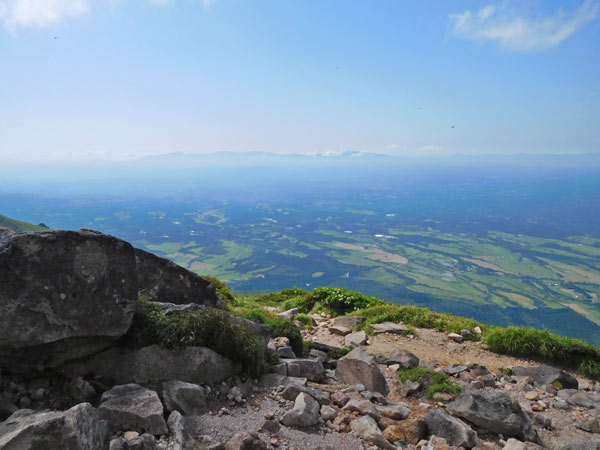 その先の丘の上から阿蘇を展望する 手前の白い花はカワラマツバ。 熊本地震の爪痕があらゆる所に残っていて心が痛む、阿蘇の根子岳の岩峰も崩れて ギザギザが丸くなっている。往生岳の山肌も幾筋もの崩れた跡が白く見える
