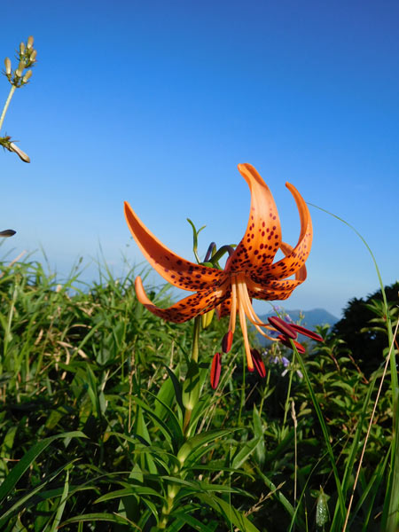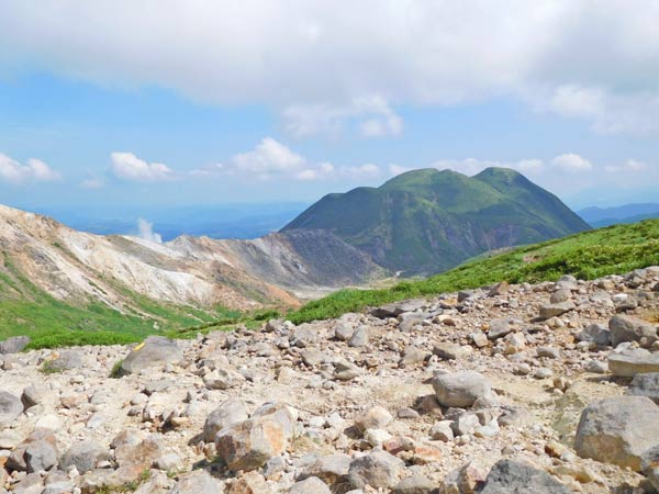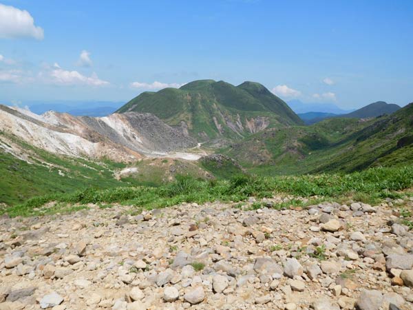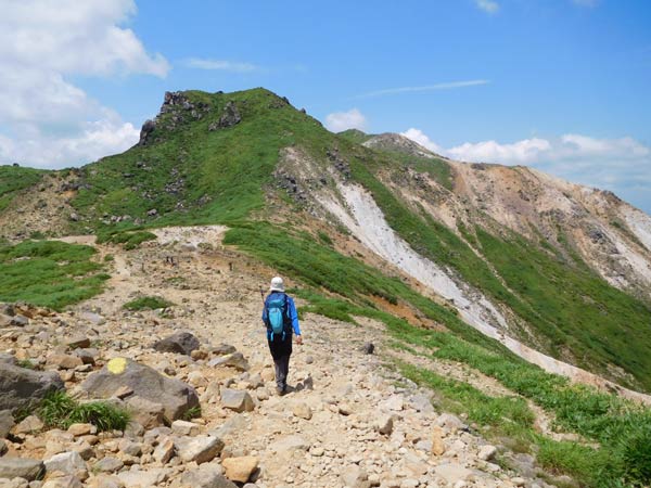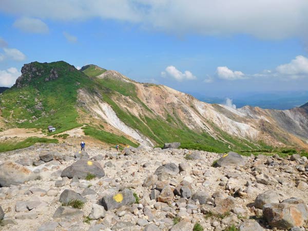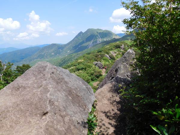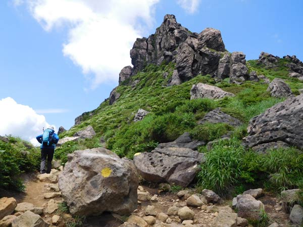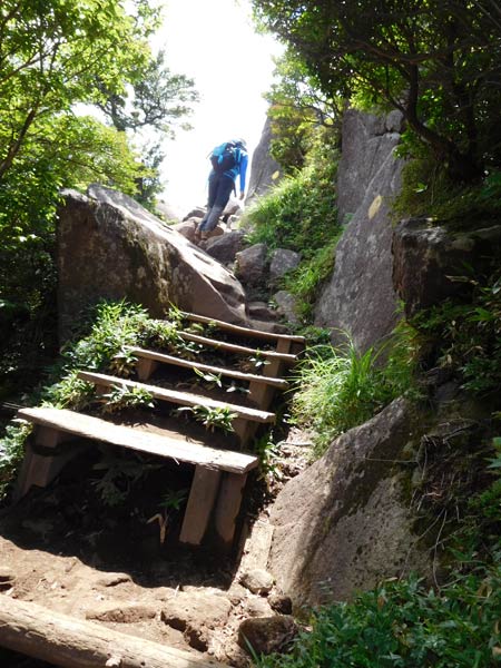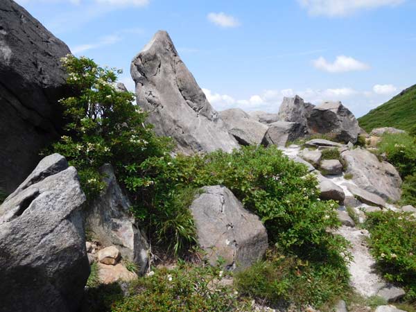 お邪魔させていただきランチタイムとする。日向はジリジリと暑いのに日陰にずっと いると肌寒さを感じる程、太陽のエネルギーの凄さを感じる。昼食を楽しんだ後は 鞍部までザレ場で足を滑らせないよう注意しながら下る