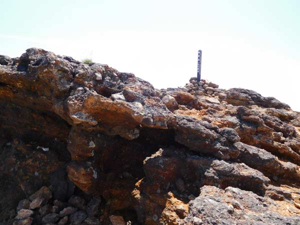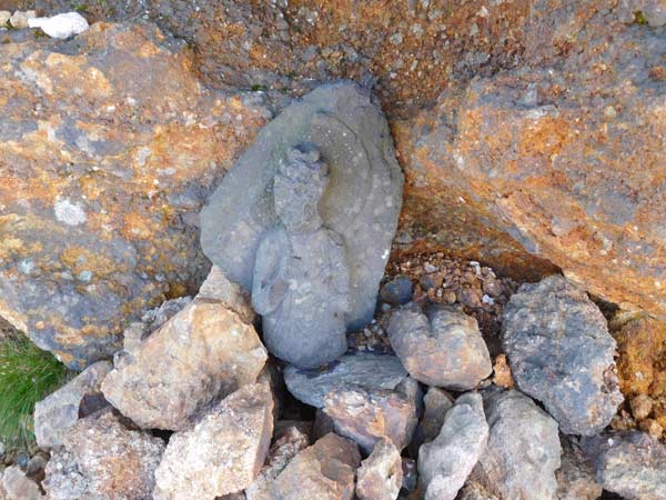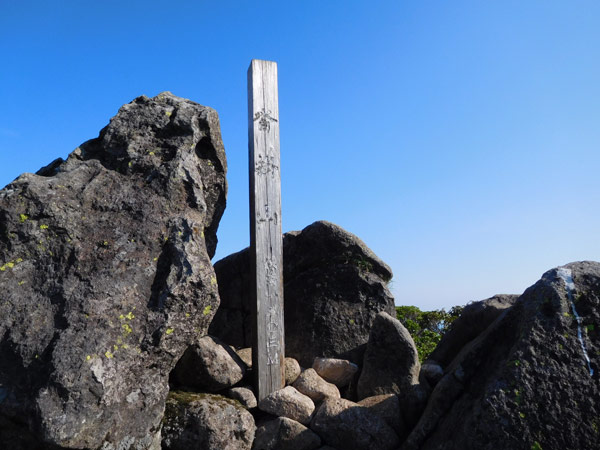右)山頂標識の下の岩陰に祠があり日陰になっていた