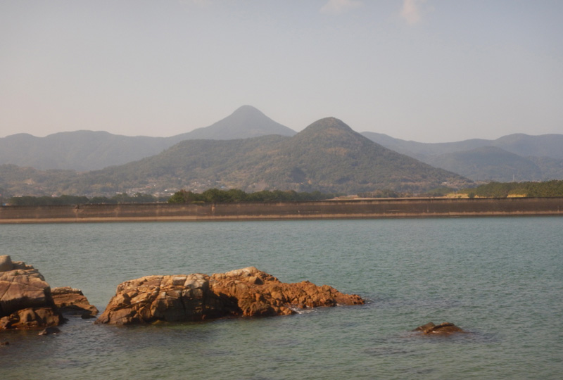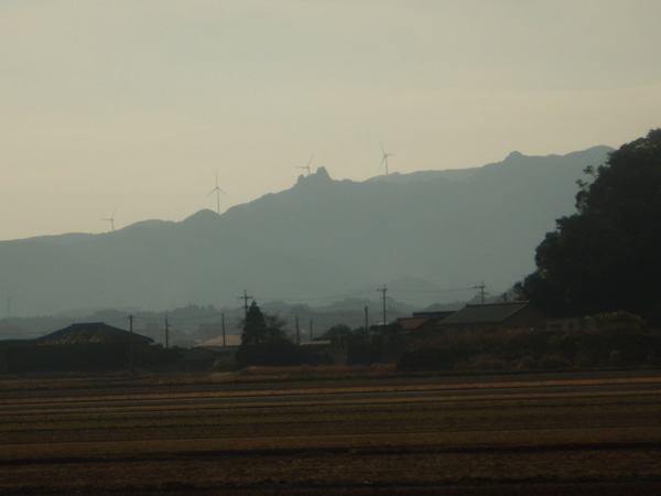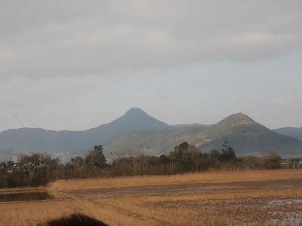 国道226号線を走るバスの車窓から野間岳(中央奥)を望む 2015年1月 鹿児島県