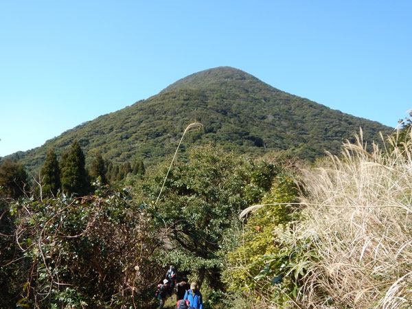 バスの車窓から遠くに磯間嶽が見える、秀麗な野間岳もだんだん近くに見えてきた。登山口に到着。